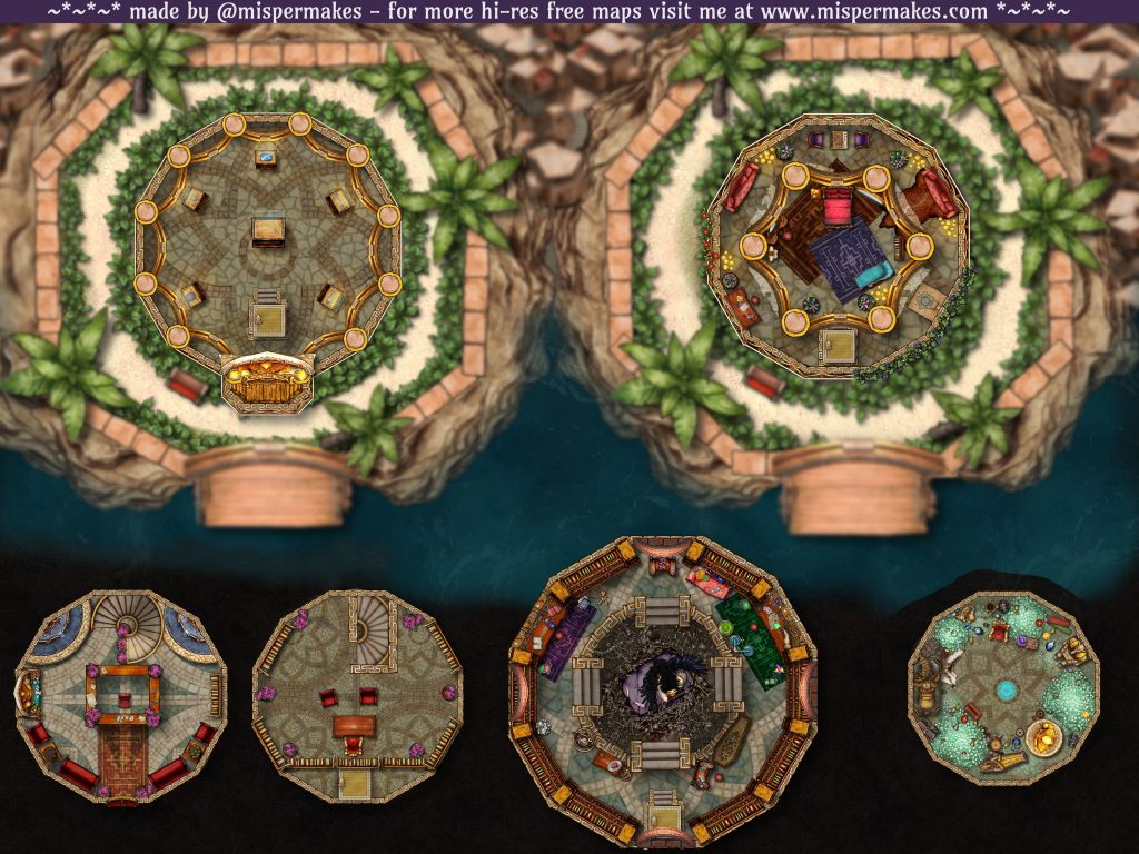 this is Xowie’s tower, where I hosted the map on the top level. The foundry VTT export comes with all the lights, doors, descriptor tags etc for items on that case floor. the study is a puzzle room where they can figure out the passcode to Xowie’s vault in his bedroom, and a sphinx in the center that can be ally or foe. it could even just be taxidermized if you don’t want to mess with it. do what you want. all these battlemaps come with the download.