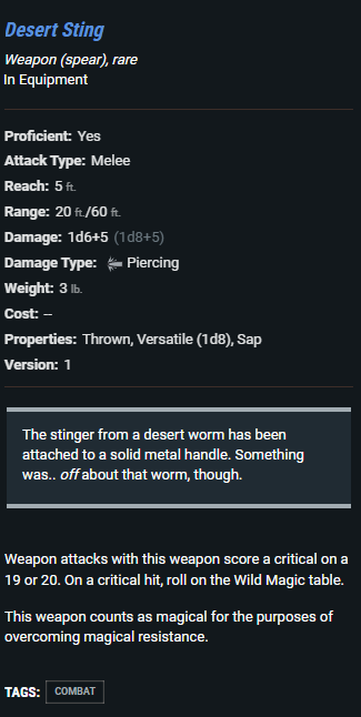 other minor encounter (sand worm) i would use combat minor playlist. the item is something i let them make out of the parts they harvested.