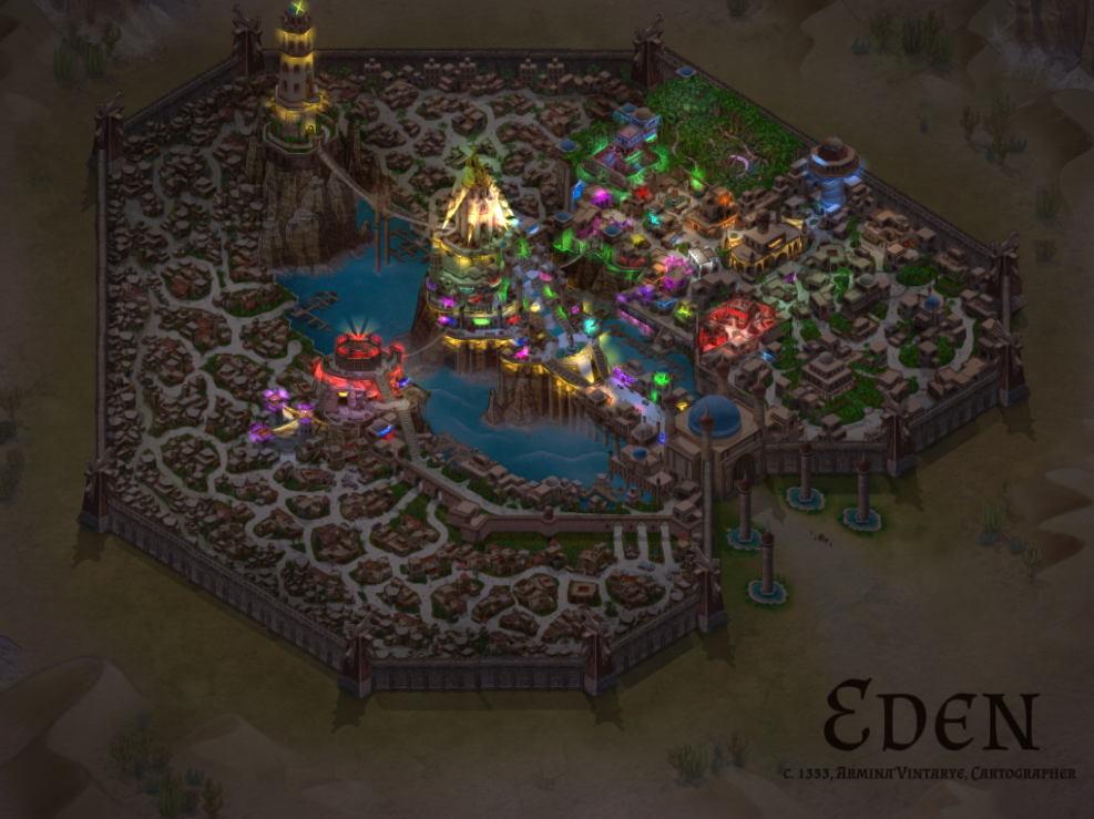 The city of Eden is an oasis within the Hellfire Wastes, accessible only by a long trek through the desert, typically from the nearby port town. Despite being in the wastes, it’s a lush, almost fantasy city — many people who have been there describe it as so outlandish that those who haven’t seen it for themselves have trouble believing it. It’s a city of wealth, luxury and convenience, yet they do not trade this with anyone else