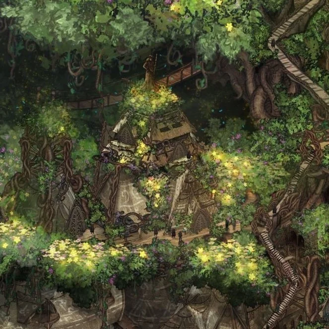this was the second iteration, and the one i actually used for a while in my campaign before also deciding that i hated it. overall i think its servicable, but i realized the largest tree was the tree all the houses were on… not the tree the chieftan lived on. i really wanted to emphasize how special and important this one “father” tree is, and how lucky certain people are TO live on it.