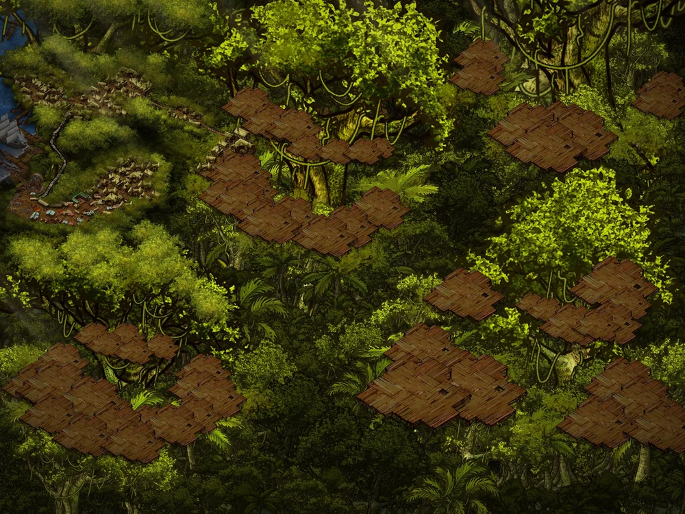 i knew i wanted it to be set on the tops of large trees, because the jungle below was supposed to be so threatening that you wouldn’t ever want to live in it. the more i made this the more it didn’t feel vertical enough — why would they expand more into the jungle than just up? and one tree is supposed to be this visibly massive, large “father” tree that just didn’t come through here. so i decided to scrap it and try again.
