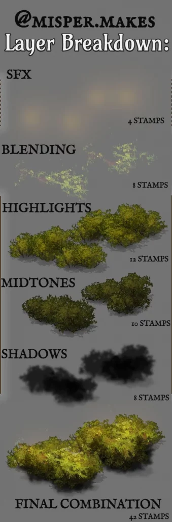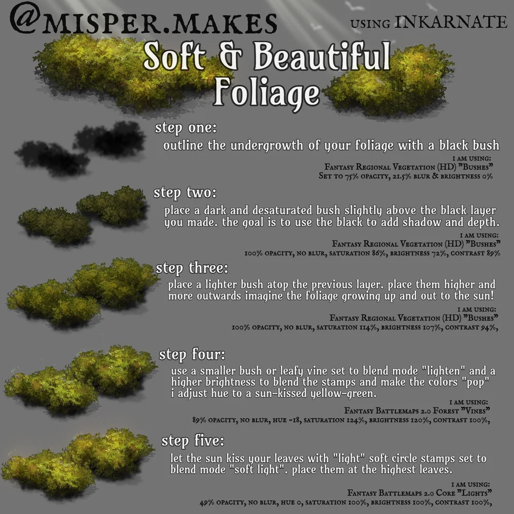 it was highly requested of me to share how i got the foliage to look the way it does in inkarnate. below is how i made all of my trees. i used the dead trees scaled really high as a “blueprint” for how a tree should be shaped, and then made my own tree trunks out of wood walls and my own foliage from layered bushes and lights. i really wanted it to feel painted, almost like hayao miyazaki’s style of foliage in movies like nausicaa and princess mononoke.