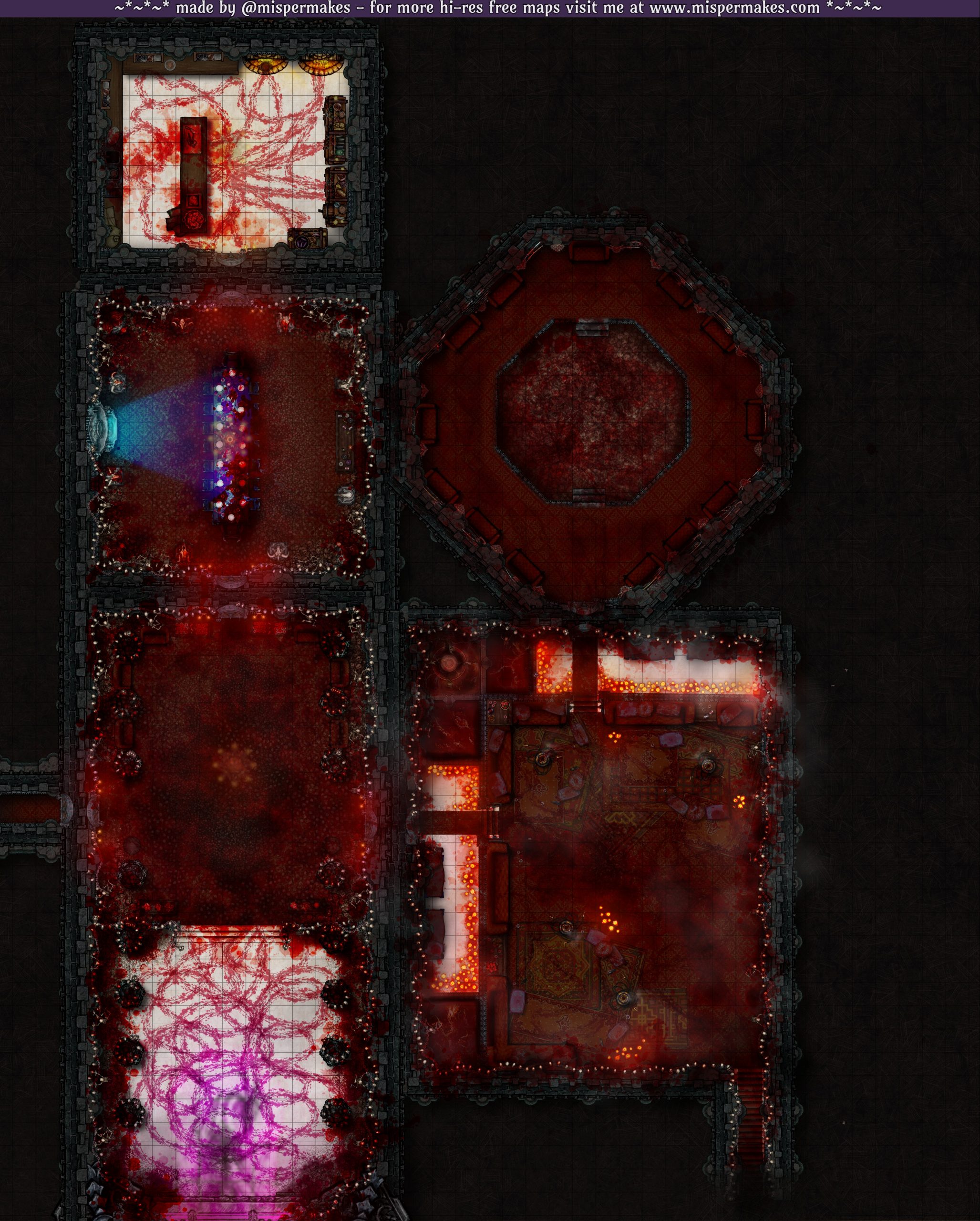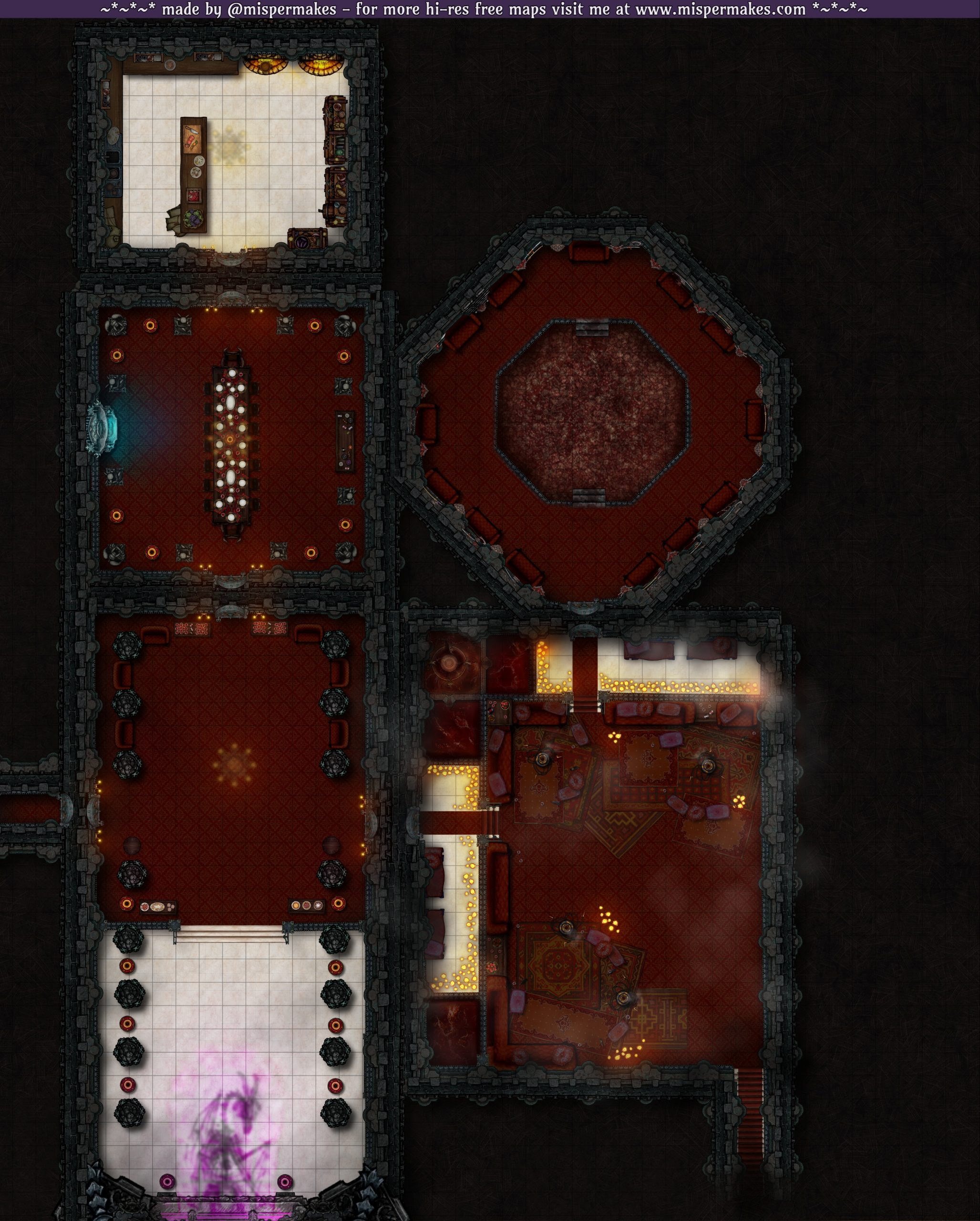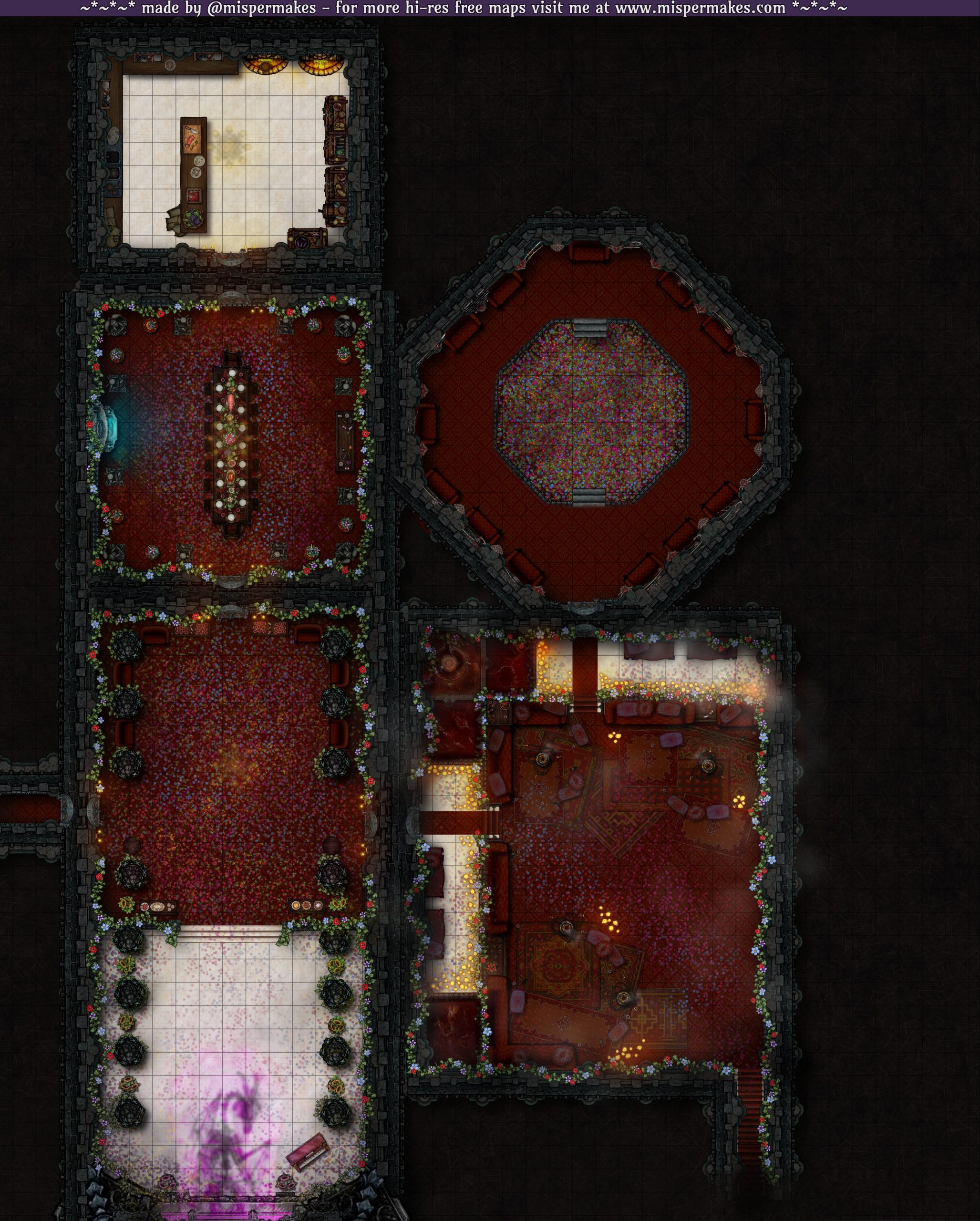 This section of the interior features a ballroom, dining hall, blood lounge and sparring pit perfect for hosting an extravagant party. Bloody and floral variants offer endless possibility—are they real? illusions? swap one for the other when an illusion breaks? Or just go normal and stick to classic gothic vibes.