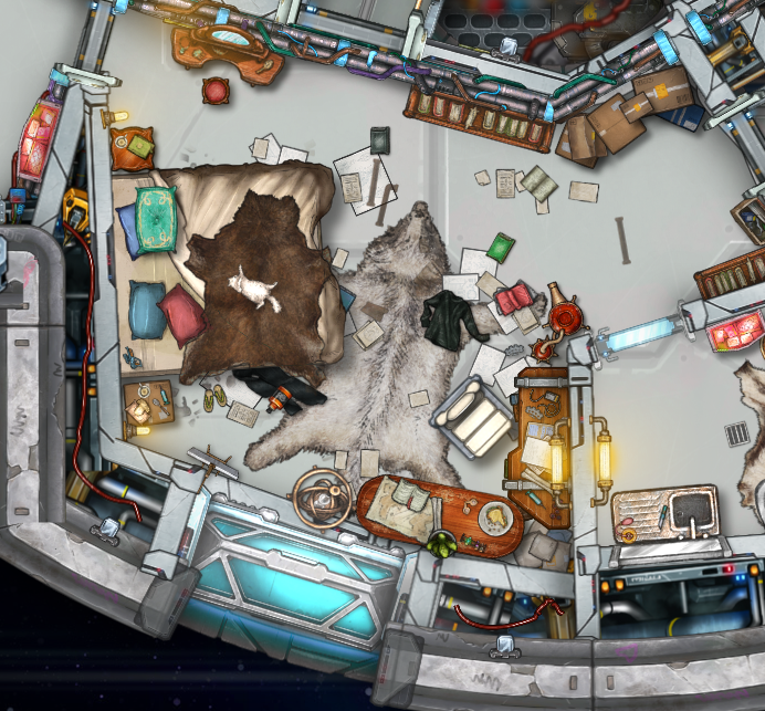 this ship was designed for my wizard/blood hunter NPC who has founded the study of chronomancy and pioneered astral travel over her centuries of magically-prolonged life. Messy, sad, brilliant — the ship isn’t any sleek, modern Star Trek voyager. Monochrome monitors, buttons and levers are what conduct powerful magic, while the ship houses the quarters of a depressed genius.