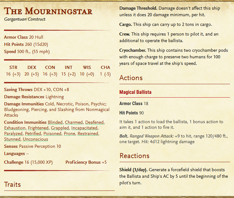 This ship is intended to be piloted by my wizard NPC and her wife, though it could work for anyone you might feel fits the style of it. It does require two people to pilot both ship and gun, and I made a stat block the best I could while using a monster stat block creator. Note ships in my universe have a much faster speed than the ones from Spelljammer, change this if you are using spelljammer. When I designed space travel I figured they would be much faster and made space a much larger area to travel to account for warp-speed like capabilities.